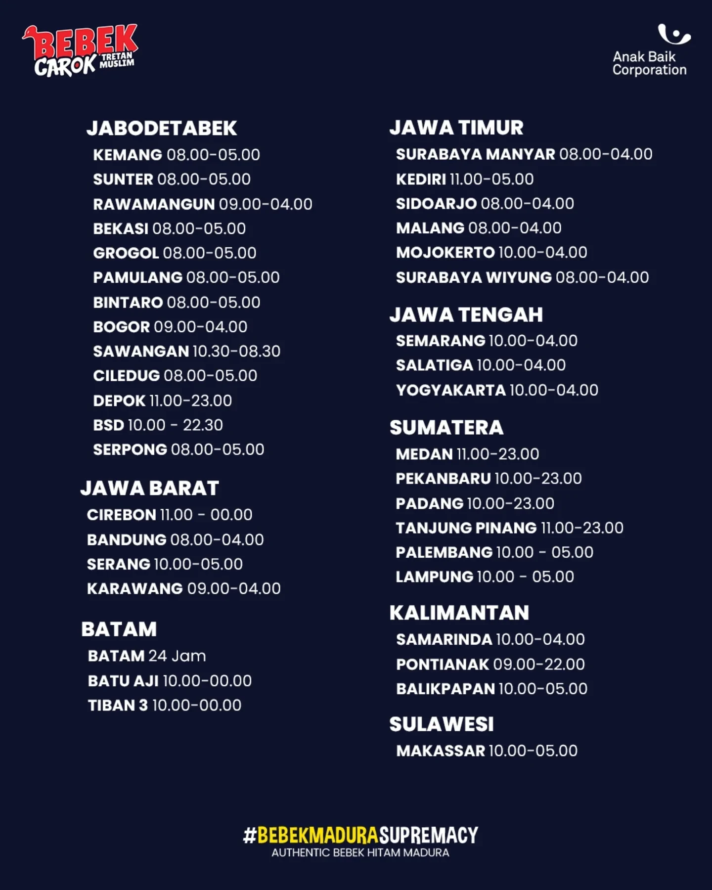 Jam operasional Bebek Carok biasanya dirancang untuk melayani pelanggan pada waktu makan utama, seperti makan siang dan makan malam. Meskipun jam buka dapat bervariasi, umumnya restoran ini beroperasi mulai dari menjelang siang hingga malam hari, memungkinkan pelanggan untuk menikmati santapan selama jam makan yang sibuk. Untuk memastikan Anda mendapatkan informasi yang akurat mengenai jam operasional mereka, sebaiknya periksa situs web resmi atau media sosial Bebek Carok, di mana mereka kemungkinan akan mengumumkan setiap perubahan atau penyesuaian jam buka, terutama pada hari libur nasional atau acara khusus. Jika Anda berencana untuk berkunjung atau memesan, mengonfirmasi jam operasional terlebih dahulu dapat membantu menghindari ketidaknyamanan.